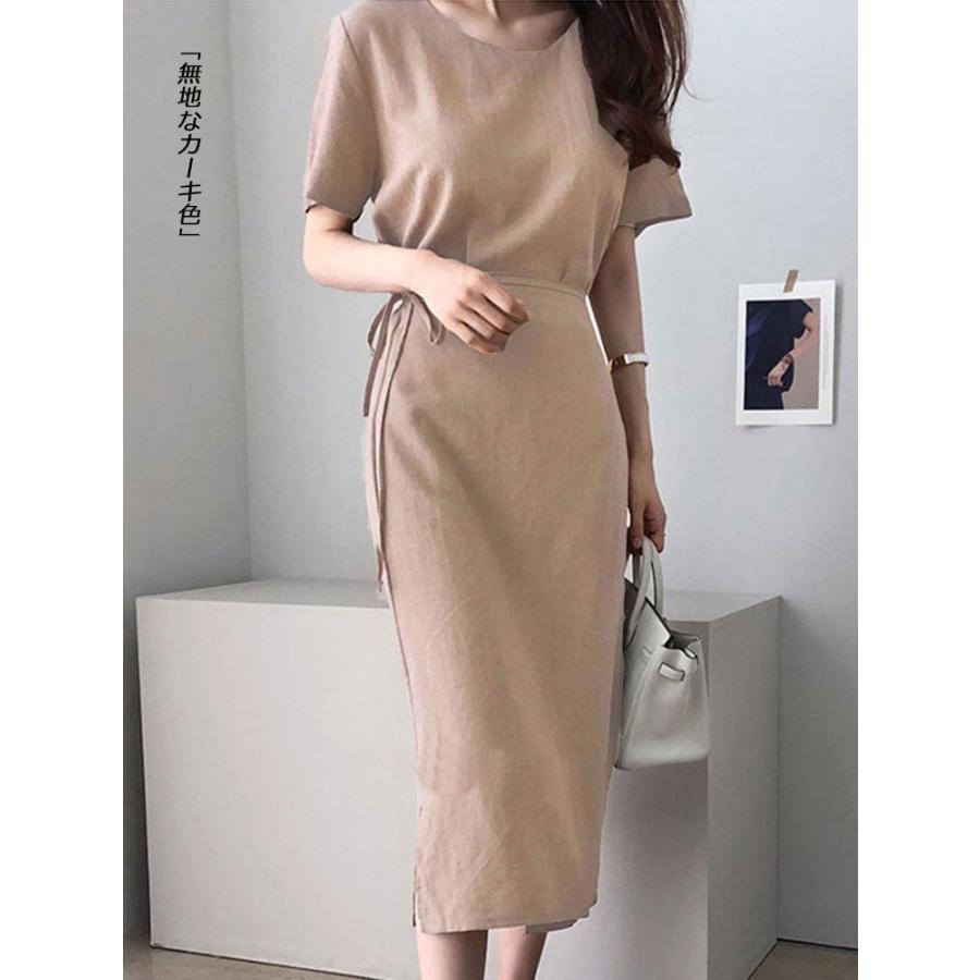 ワンピース 夏 ロング丈 レデイース 半袖 ロングワンピ タイト 無地 体型カバー リネン スリット デザイン リボン ラウンドネック おしゃれ 01op946 福丸 通販 Yahoo ショッピング